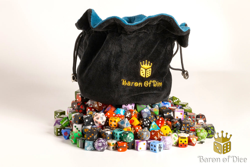 Each bag features several compartments to store your different dice plus a large center opening to store your favorites! Every bag is custom made using choice velvet exterior and a suede interior; 7.5" on all sides and featuring our logo on the backside, you can hold x550+ dice in each bag. The jet black exterior material is a dense velvet for extreme durability while the interior lining is a lightweight sapphire colored suede to protect those dice with unparalleled softness.