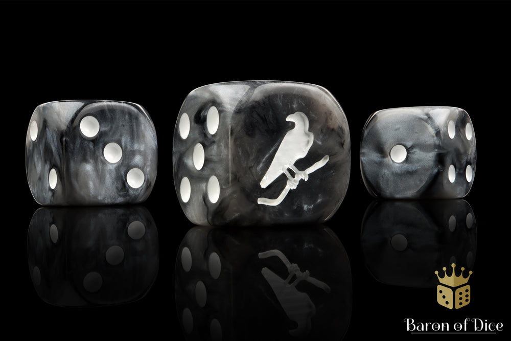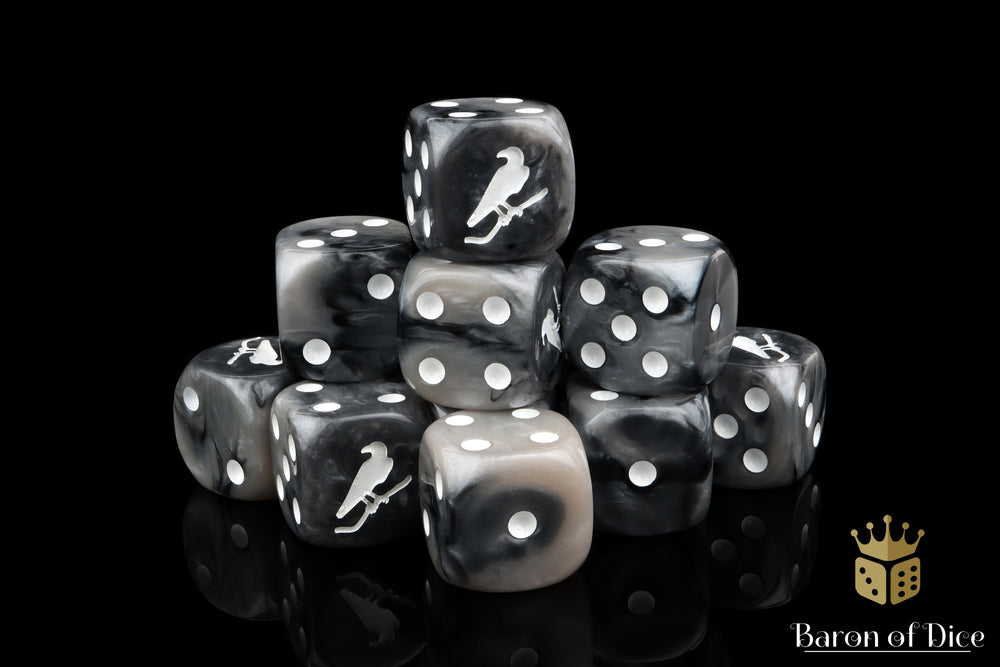 Darkness is approaching, the night is gathering. These contain a combination of enveloping blacks swirled with twilight greys and inlaid with a pure white; hand mixed resin 16mm dice. The symbols are on the 6 side. Our premium dice come in unique reusable tins when purhcased in x25 and x50 counts.