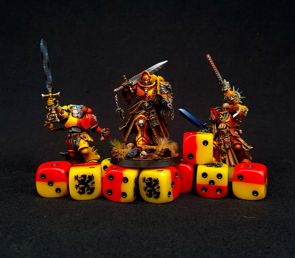 Onto the Fury of Battle! These contain a layered bright and bold yellow followed by a battle hardened red and inlaid with a valiant pure black; resin 16mm dice.  The symbols are on the 6 side. Our Premium dice come in unique reusable tins.