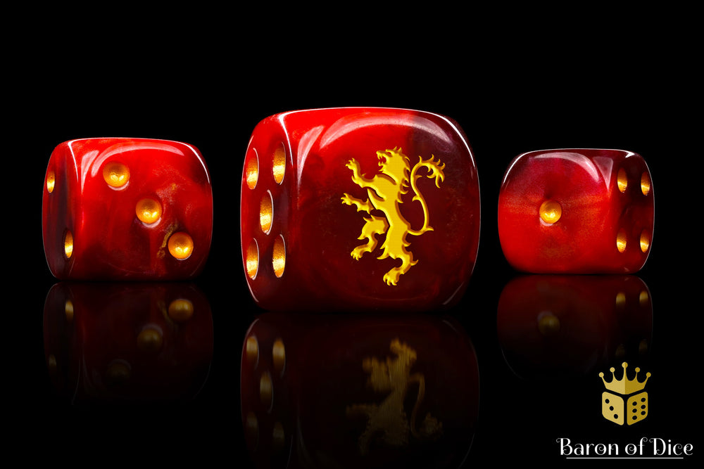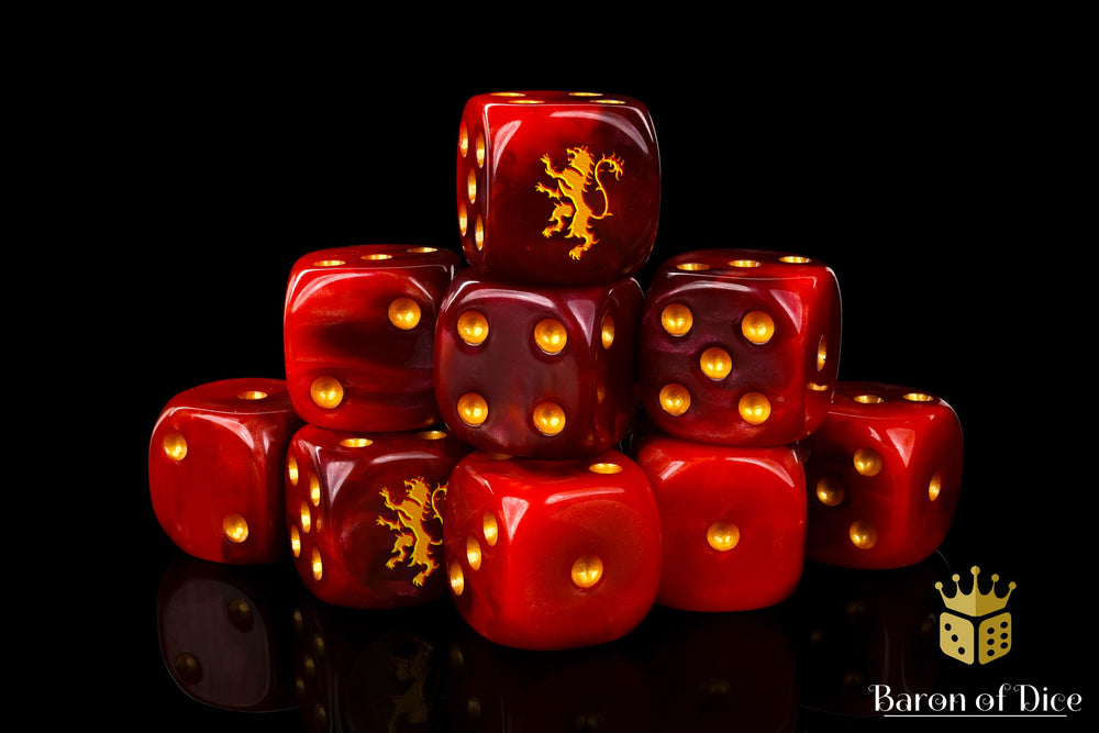 These contain a mix of brilliant bright reds swirled with deep wine reds and inlaid with a metallic gold; resin 16mm dice.  The symbols are on the 6 side.  Our x25 count and x50 count of premium dice now come in a premium reusable tin!