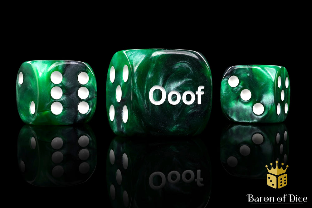 These contain a swirling of warp-tainted greens swirled with pure black and inlaid with a pure white; resin 16mm dice.  The symbols are on the 1 (ONE!) side. Our premium dice now come in a unique reusable tin.