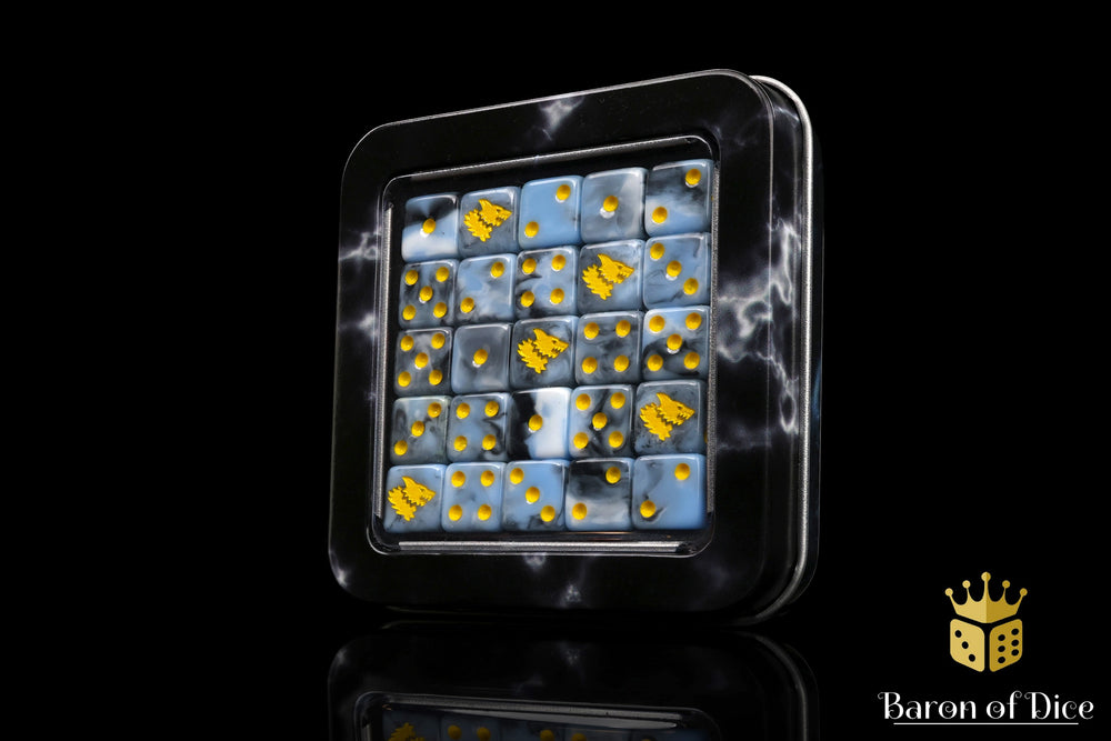 These contain a mix of melting blue and icy white hues swirled with a noble black and inlaid in a pure white; resin 16mm dice. The symbols are on the 6 side. These dice come in round corner, square corner, or 12mm mini; choose wisely! Our premium dice now come in a unique reusable tin.