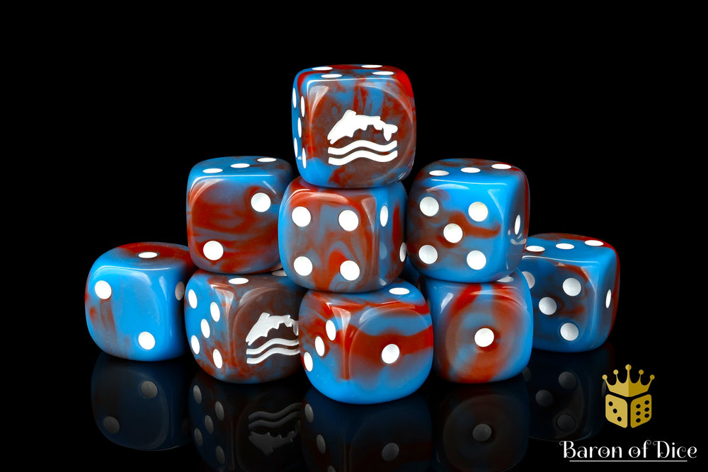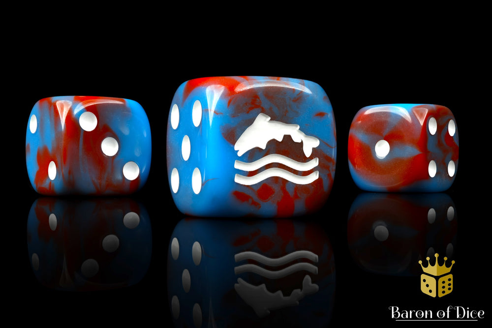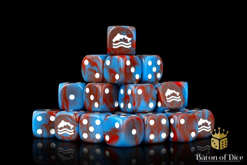 Family, Duty, and Trout?! These contain a mix of honorable blues swirled with muddy reds and inlaid with a crisp white; hand mixed resin 16mm dice. The symbols are on the 6 side. Our premium dice come with unique reusable tins.