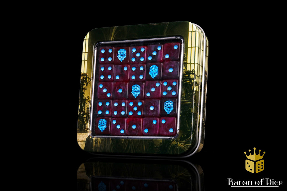 The Dwarves go marching to war!  These contain a mix of rich reds swirled with space darkened blacks and inlaid with a bright glowing blue; hand mixed resin 16mm dice.  The symbols are on the 6 side.  These dice have an option of round or square corner, choose wisely!