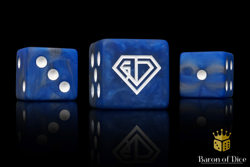 Featuring a base of legendary blues and grey swirls and inlaid in a pure white; resin 16mm dice. These are Matte finish dice. The symbols are on the 6 side.