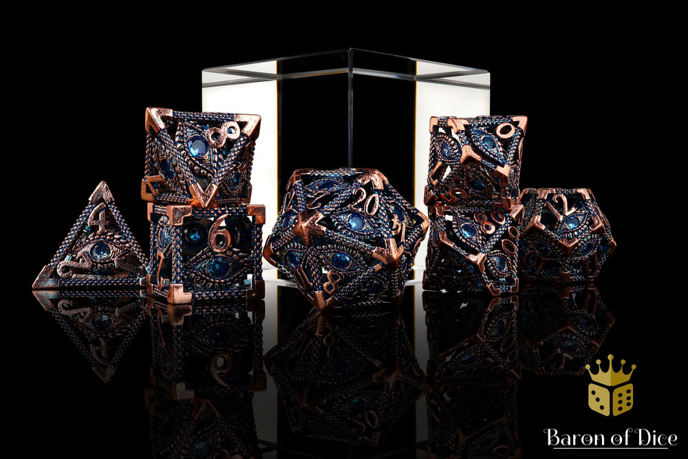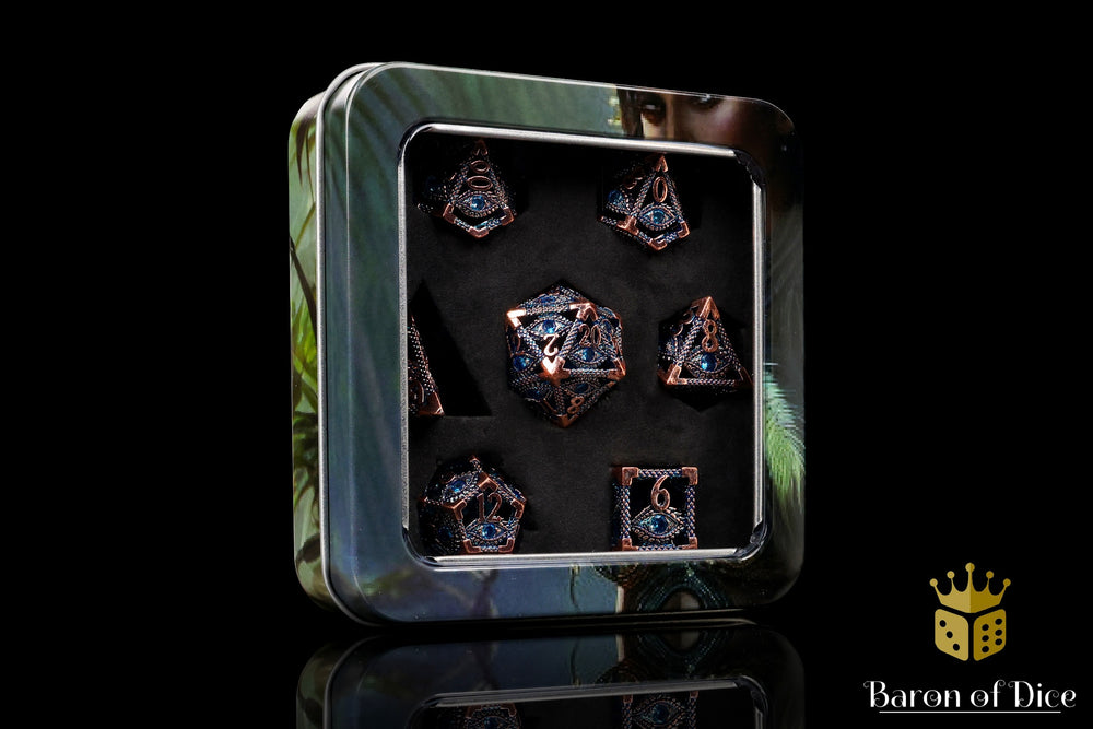 This set is made from worn bronze, honed to a shine. Cut from the Earth's veins, these metal dice are ready to blow your mind! Featuring an all-seeing eye design across each die, in shining copper, these are inlaid with faded blue energy; premium metal 20mm dice set containing D4, D6, D8, D10, D10, D12, and D20.