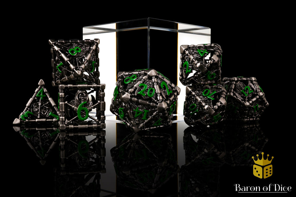 This set is made from wrought steel, honed to a glow. Cut from the Earth's veins, these metal dice are ready to blow your mind! Featuring a grim reaper design across each die, in shining steel, these are inlaid with dark green energy; premium metal 20mm dice set containing D4, D6, D8, D10, D10, D12, and D20.