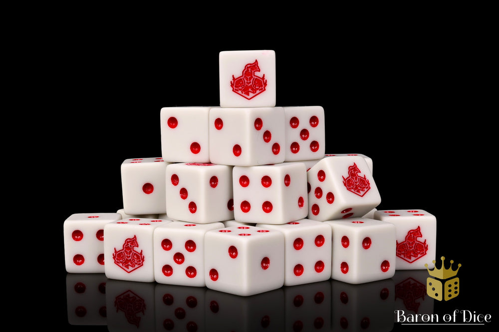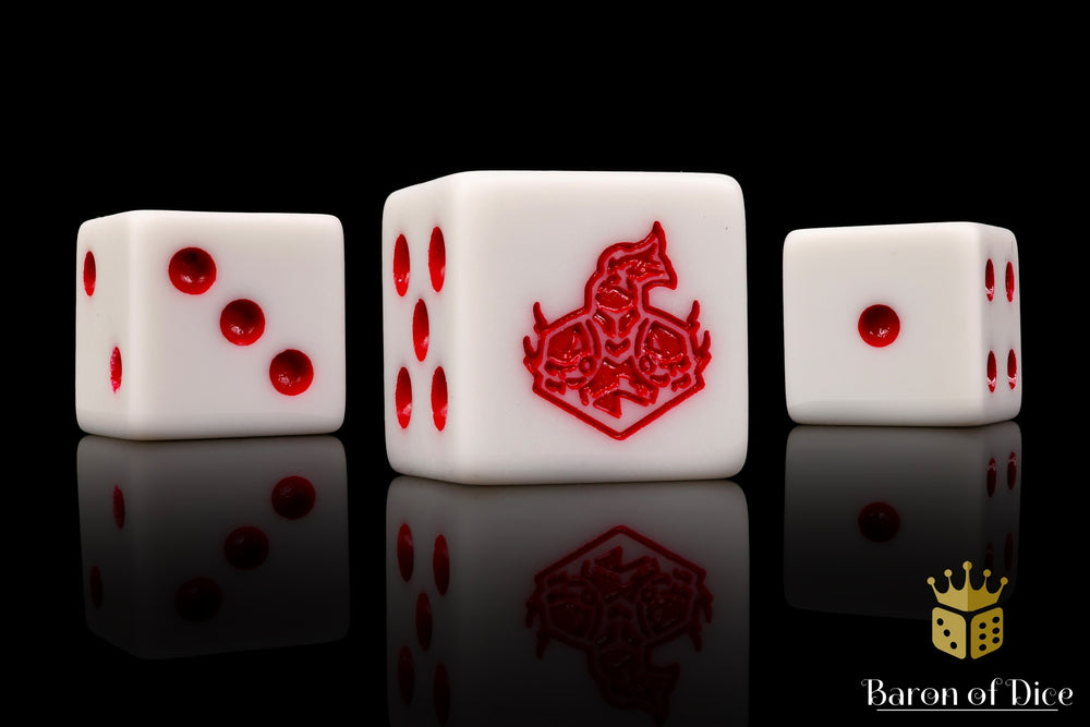 Featuring a base of marbled light greys and inlaid in a bright bloody red; resin 16mm dice. These are matte finish dice. The symbols are on the 6 side.