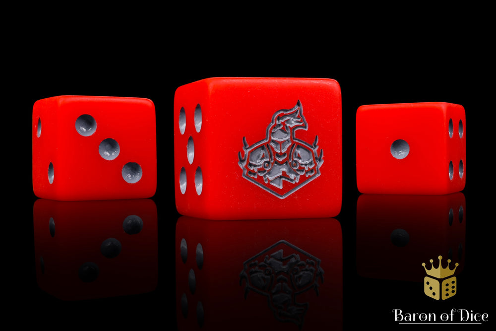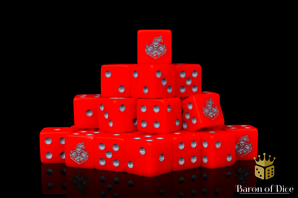 Featuring a base of bright bloody red and inlaid in a light stone grey; resin 16mm dice. These are matte finish dice. The symbols are on the 6 side.