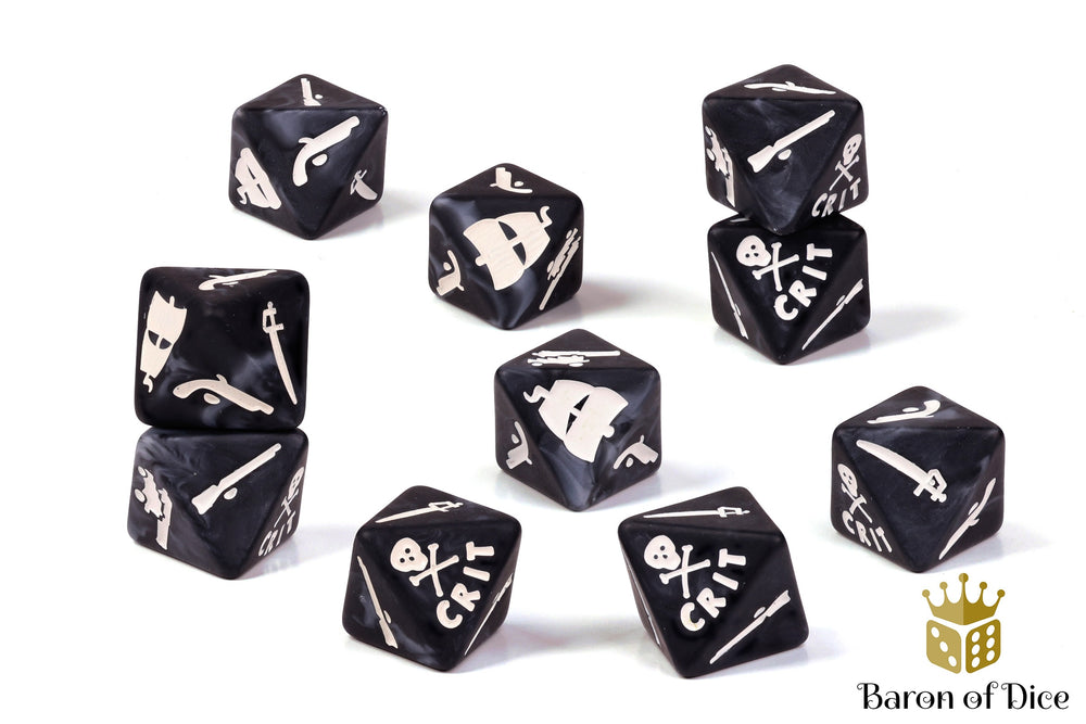 Pirates feature a matte black swirled with silver veins and inlaid with a pure white; resin 16mm dice. All dice are accompanied in a sweet metal tin surrounded by EVA foam. Show up in style!