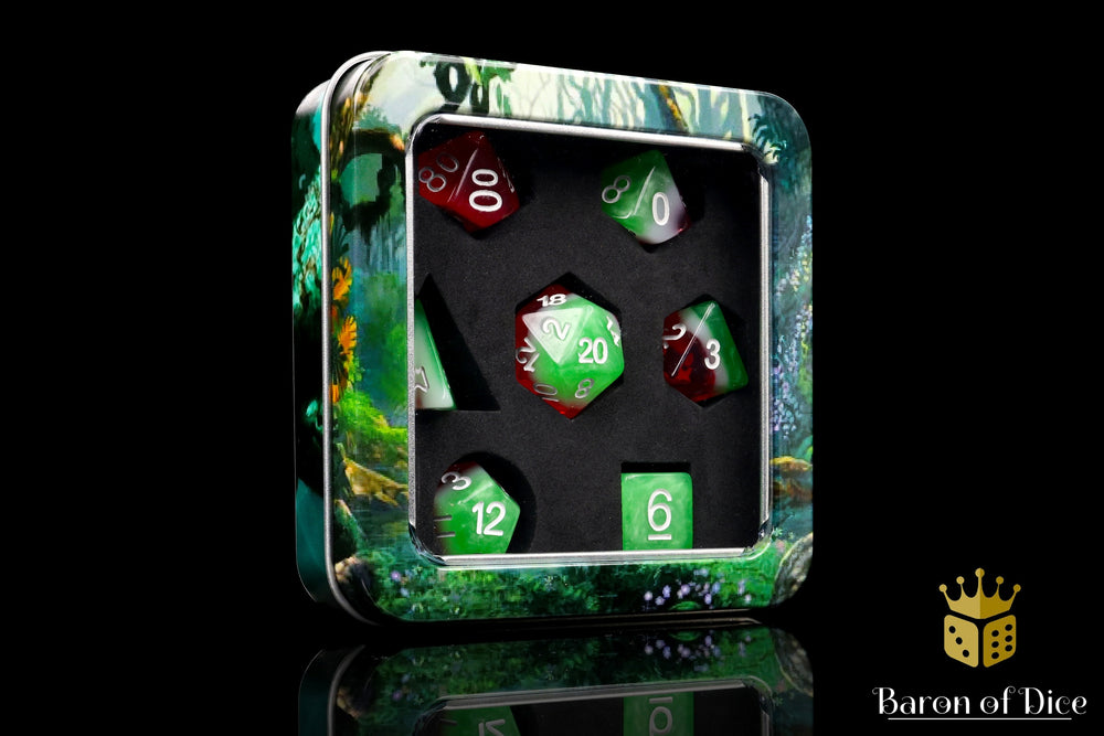 When these dice hit the table a sudden vigor awakes, you feel ready to encounter the renown winged Demi-God...Sure enough, you realize it's the beer in your other hand giving you this newfound courage, too late; nonetheless these are the best dice out there and the epic rolls leave you victorious!  Our premium polyhedral dice come in unique metal tins!