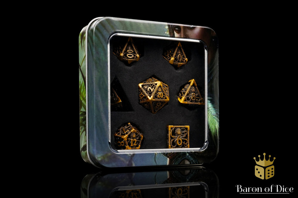 This set is polished Sunken Treasure from Ol' Red Beard's hoard! Featuring krakens, octopus, and squid designs across each die, in polished golden hues, these are ready to burst from the depths; premium metal 20mm dice set containing D4, D6, D8, D10, D10, D12, and D20.