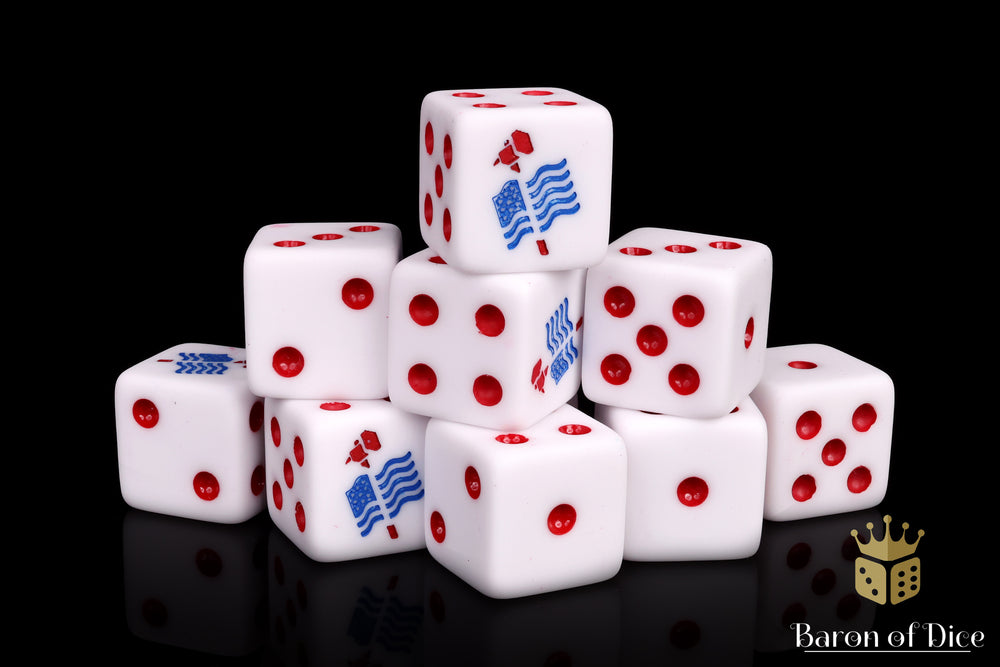 These contain a matte white base and inlaid with a two-toned bright blue and bloody red; resin 16mm dice. Quickly see if you have a 1 or 6 with these matte finish dice. The symbols are on the 6 side. These are square corner dice! Let's go TEAM USA!!!!