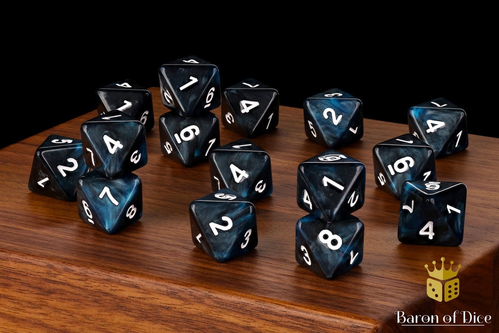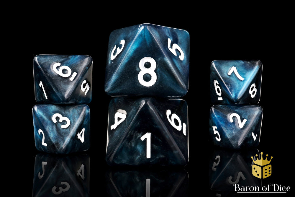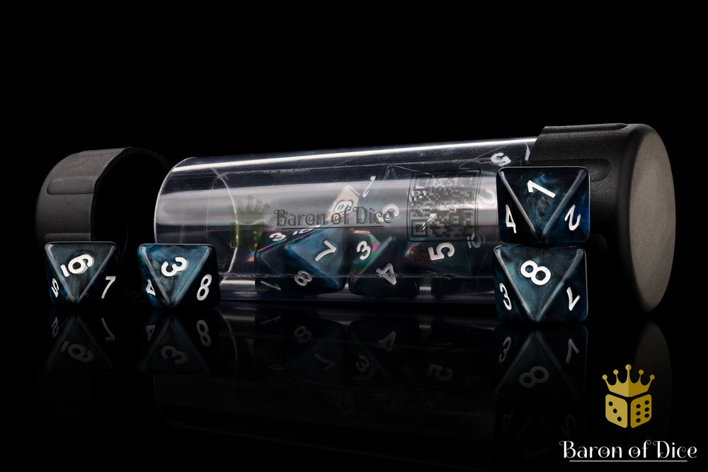 These contain a base of galactic blues and deep blacks and inlaid with a pure white; resin D8 dice. There are no symbols, each tube contains x15 D8 dice. Our premium dice now come in a unique reusable tube.