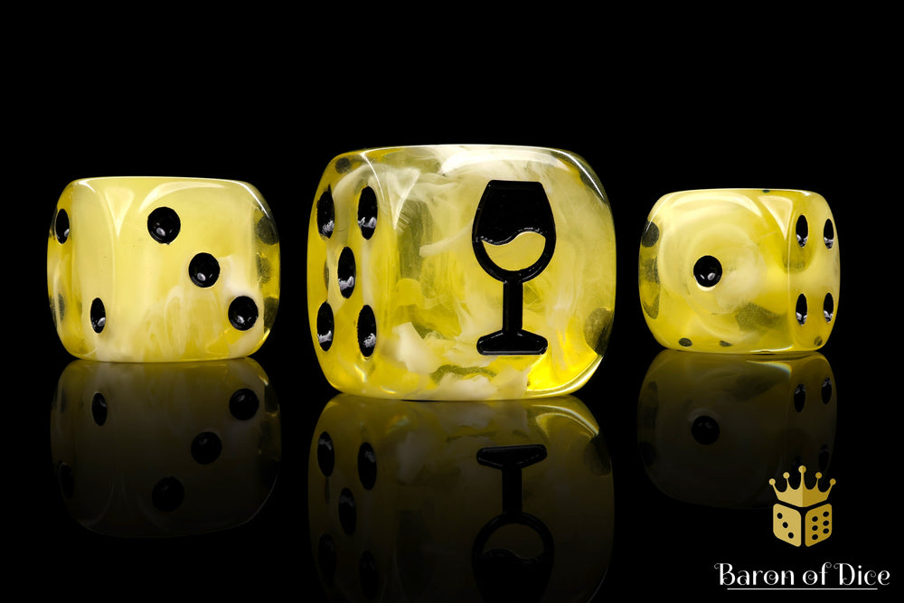 These are hand-mixed resin dice; combining light, fruity translucent Chardonnay yellows swirled with veins of white and inlaid with a pure black; resin 16mm dice. The symbols are on the 6 side. These dice come in round corner or square corner; choose wisely! Our premium dice now come in a unique reusable tin. DO NOT FORGET TO PAIR THESE WITH OUR RED WINE, BEER, AND CHEESE DICE!