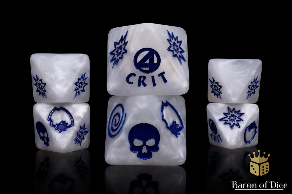 Two is a pair, three is odd, four... now that is a party!  These contain a our unique white marbled pearlescent and inlaid with a dark blue.  The symbols are all unique with a focus on a singular critical die face differentiating the designs.  Each set comes with x10 count, D8 dice encased inside an exclusive metal tin.