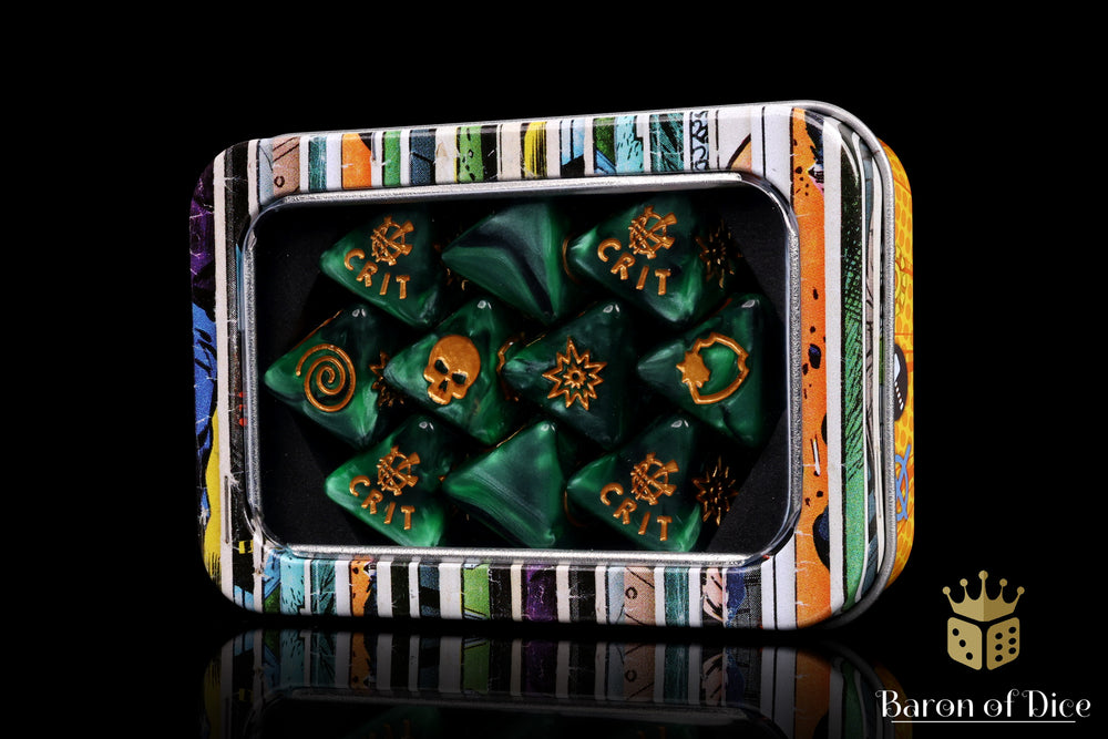 There are always alternatives... These contain a base of bright green lucent, with warp black veins creating a creeping across the die faces and inlaid with a metallic gold. The symbols are all unique with a focus on a singular critical die face differentiating the designs. Each set comes with x10 count, D8 dice encased inside an exclusive metal tin.