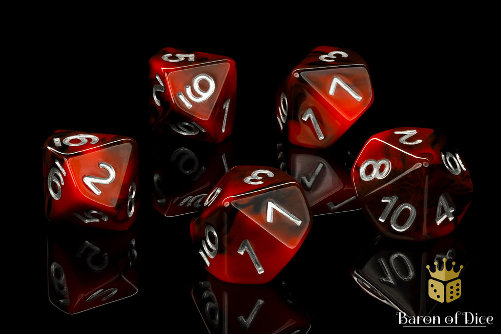 Keeping track of wounds, command points, or victory points with a D6? Time to upgrade! Sold by the single count or a pack of 5. These contain a combination of sinister reds swirled with leeching blacks and inlaid with a dazzling silver; hand mixed resin 16mm D10 dice. Numbers 1-10.