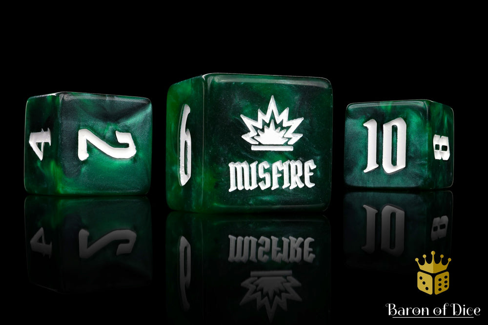 The tremors are increasing, buildings are failing, the earth quakes with unnatural vengeance in the distance and destruction is wanton; load the artillery and FIRE! Each die is premium hand mixed resin; containing warp infused greens swirled with black veins and inlaid with an easily readable white.