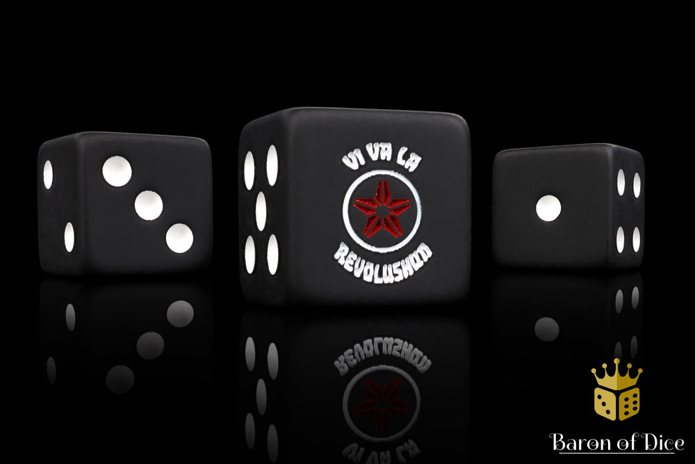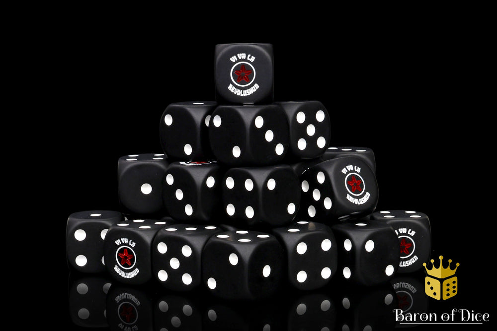 These contain a base of matte black and inlaid with two-toned pure white and bloody red; resin 16mm dice. For all da True Bosses. The symbols are on the 6 side. These dice have an option of round corner, square corner or 12mm mini size, choose wisely! Our premium dice now come in a unique reusable metal tin.
