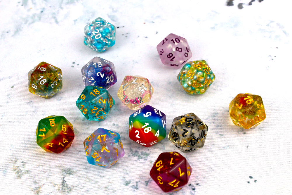 Each D20 die from Baron Of Dice, includes a single D20 polyhedral die, all are made with hand-mixed resin.  Some include gold flakes, rainbow bits, glitter, resin fruit, spooky green swirls, black and blood swirling, rainbow layered, shimmery quartz, the options are nye endless!  You will receive a random D20.