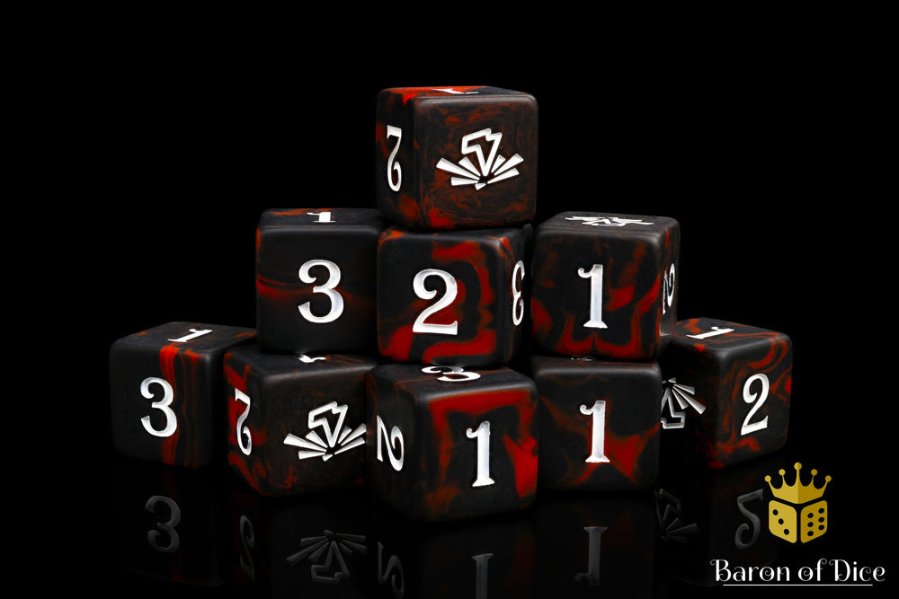 The tremors are increasing, buildings are failing, the earth quakes with unnatural vengeance in the distance and destruction is wanton; load the sustained fire dice and FIRE! Each die is premium hand mixed resin; containing a blacken earth and bloody red swirled together and inlaid with a crisp white. Both are a matte finish.