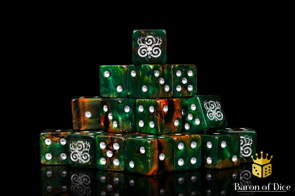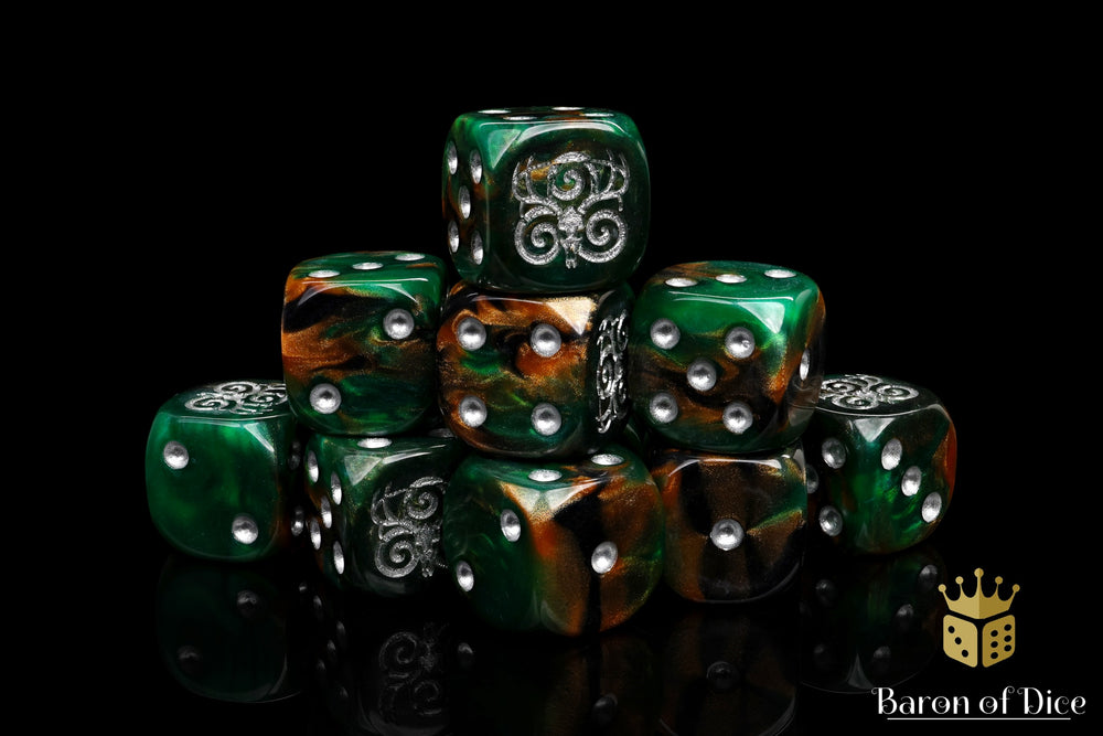 These contain a base of shimmering dark greens swirled with metallic copper veins and inlaid with a metallic silver; resin 16mm dice. The symbols are on the 6 side. These are square dice. Our premium dice now come in a unique reusable tin.
