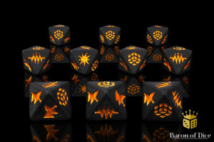 This set of x10 dice contain a complete set of dice with unique symbols to represent which scenario to play for X-wing tabletop game system. Why not randomize it?! These are NOT OFFICIAL DICE SETS. Our dice are hand swirled, matte black with a gold inlay; they are balanced luxury dice.