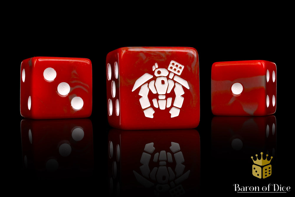 These contain a mix of fierce reds swirled with a machine grey and inlaid in the purest white; resin 16mm dice.  The symbols are on the 6 side.  These dice come in round corner or square corner; choose wisely! Our premium dice now come in a unique reusable tin.