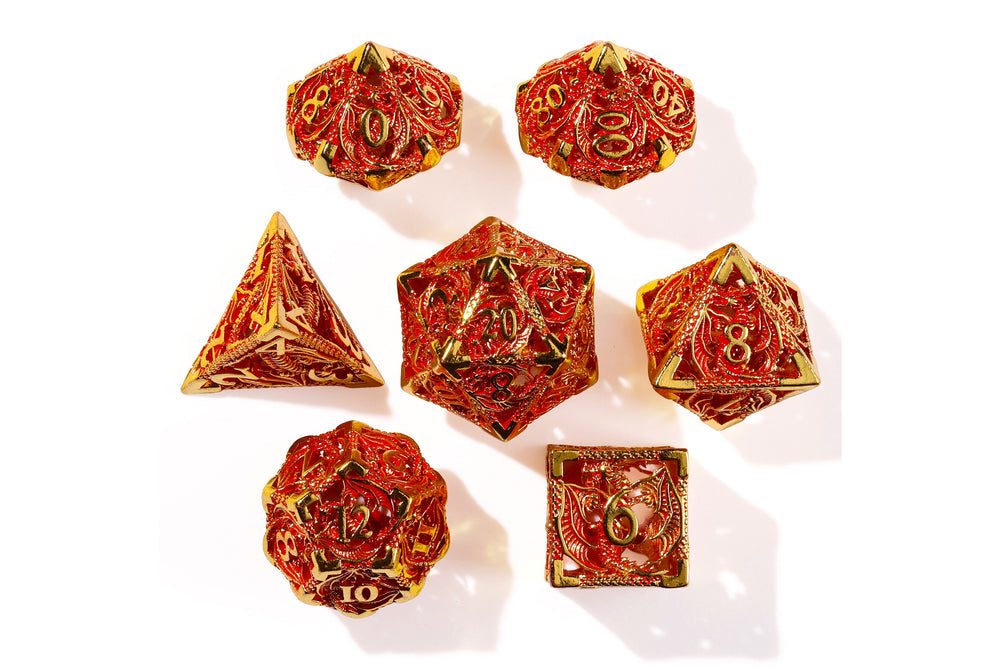 This set is made from polished golden hues, burnished by red flame. Featuring dragons twisted across each die, these are ready to reign from the skies; premium metal 20mm dice set containing D4, D6, D8, D10, D10, D12, and D20.