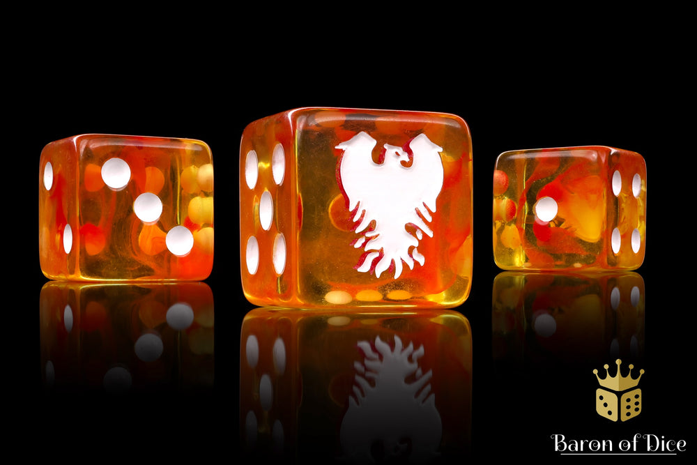 These are a bright translucent fire within each die. Featuring a glowing yellow base swirled with roaring orange fire and inlaid with pure white; resin 16mm dice. The symbols are on the 6 side. These dice have an option of round or square corner, choose wisely! Our premium dice now come in a unique reusable tin.