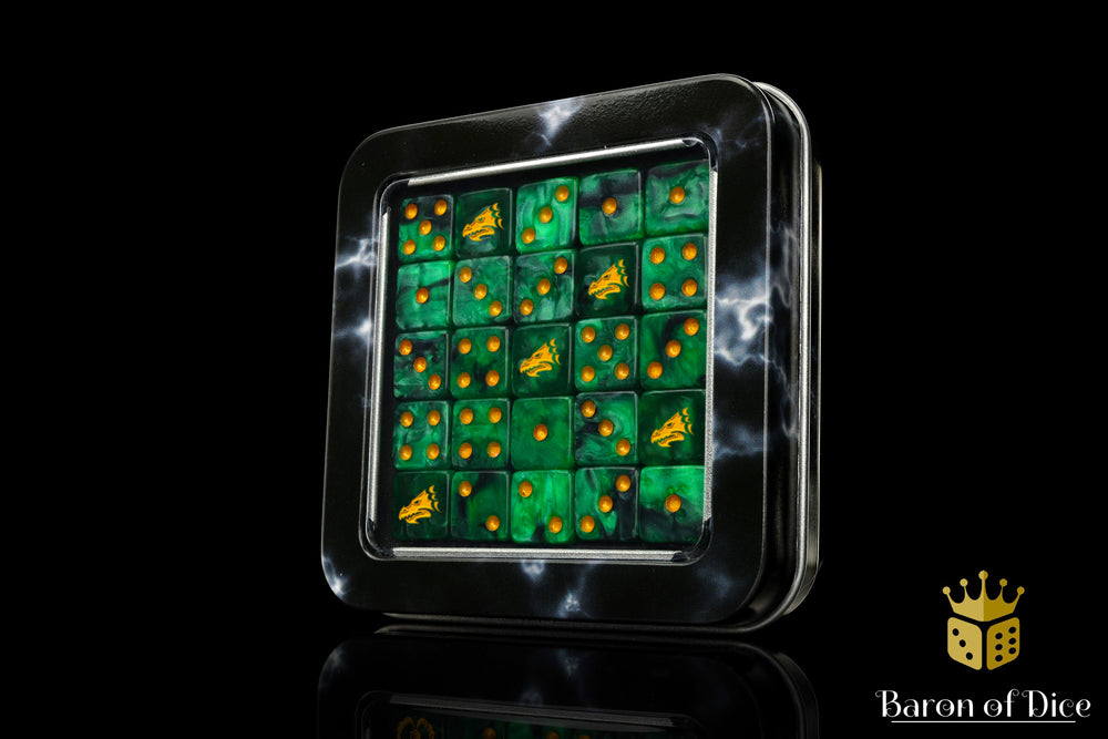 Onto the Fires of Battle! These contain a base of dark emerald green with veins of charcoal black and inlaid with a metallic gold; resin 16mm dice. The symbols are on the 6 side. These dice come in round corner, square corner, or 12mm mini; choose wisely! Our premium dice now come in a unique reusable tin.