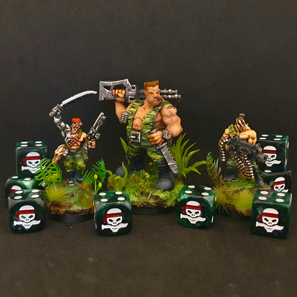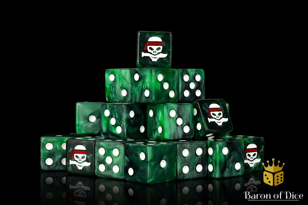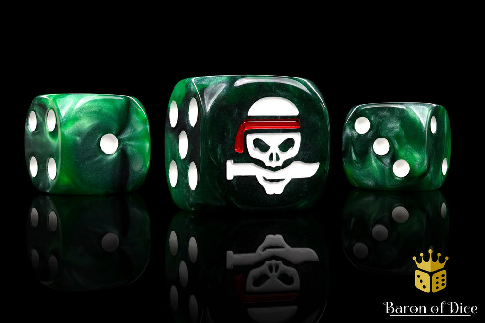 Dare to venture into the jungles? These contain a mix of green foliage swirled with black ichor and inlaid with a two-toned crisp white and bloody red bandana; resin 16mm dice.  The symbols are on the 6 side. These dice have an option of round corner, square corner or 12mm mini; choose wisely! Our premium dice now come in a unique reusable tin