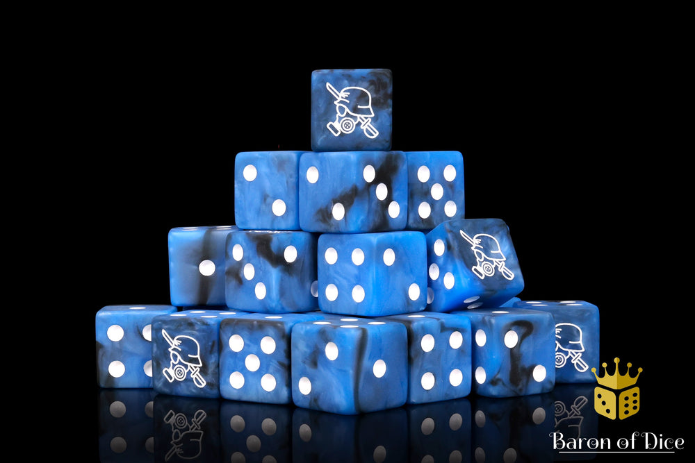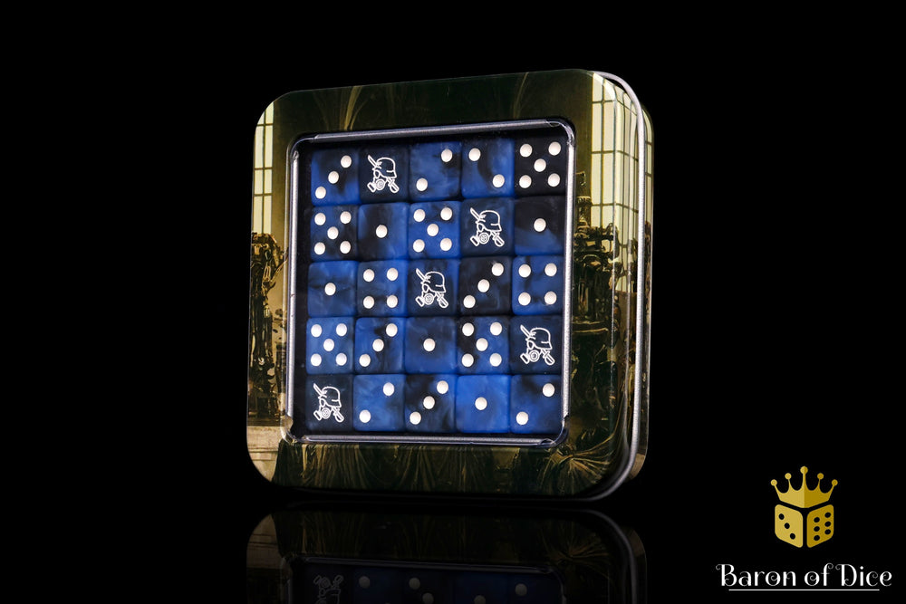 Atonement, Brothers. These contain a mix of radioactive combination of drab blues swirled with veins of scorched black featuring a matte finish and inlaid with a crisp white; resin 16mm dice.  The symbols are on the 6 side. These dice have an option of round corner, square corner, or 12mm mini; choose wisely! Our premium dice now come in a unique reusable tin
