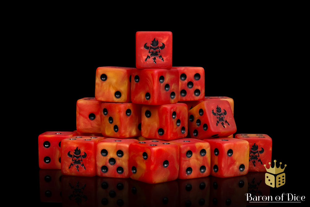 These contain a mix of fiery oranges swirled with deep smoldering reds and inlaid in the darkest black; resin 16mm dice. These are a matte finish! The symbols are on the 6 side. These dice have an option of round or square corner, choose wisely! Our premium dice now come in a unique reusable tin. Consider the 8 count for Blessing of Blood rolls!