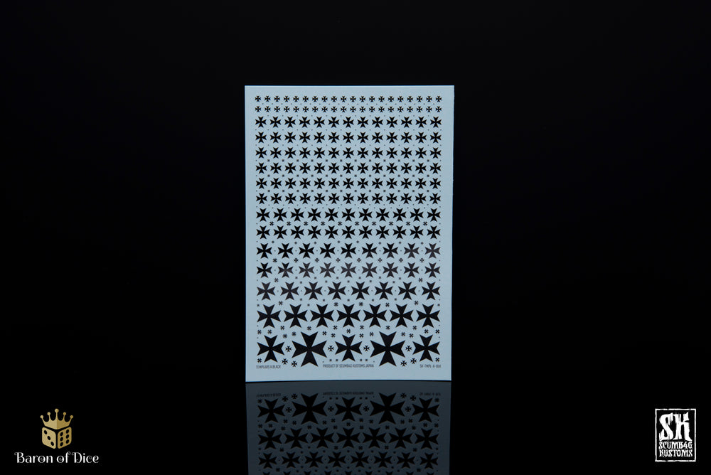 The Templars A waterslide decal sheet features a large selection of Maltese icons in a wide range of sizes, making it suitable for everything from fine detail work to bold vehicle markings. The extensive size variety allows these decals to be used on tiny facial markings, armour details, shields, banners, vehicles, and large flat panels, giving maximum flexibility across different miniature scales. Each cross is printed with individual shaped film, allowing every symbol to be cut out and applied separately with minimal excess carrier film. This ensures clean placement, precise positioning, and a smooth, painted-on appearance once sealed.